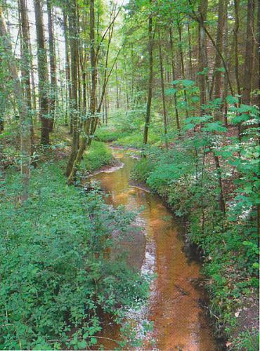 außerhalb des Waldgebietes auf einer Länge von ca. 1,5 km auf seinem Weg zur Mündung in den